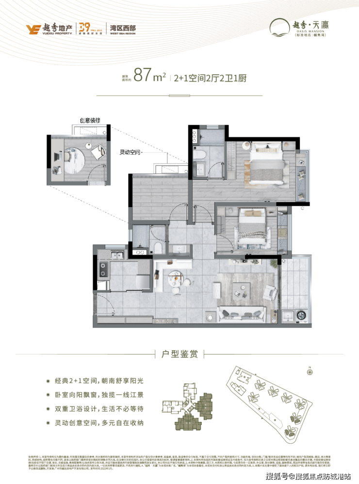 87㎡三房两卫:南向三开间,U型厨房动线合理,主卧带独立卫浴,总价约320万起,月供压力低于周边同面积段二手房;