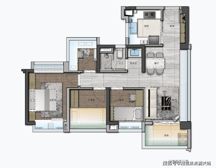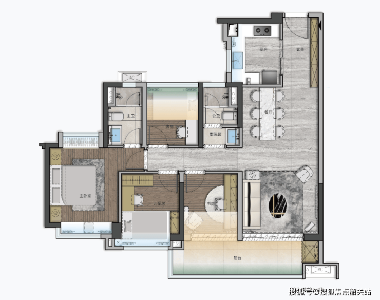 105㎡四房户型:105㎡的户型非常适合三代同堂的大家庭,空间更为富足。每个房间的设计都经过精心布局,且公卫和主套卫生间均采用了干湿分离设计,提高了居住的舒适性和安全性。