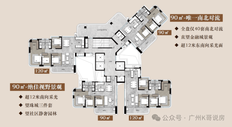 南北地块户型设计差异化打造,南地块纯板楼主打建面 120-210㎡大四房改善户型,全部采用正南北纯 T2 板楼布局,户型格局方正、南北通透、动静分区合理,大面宽南向设计,多开间朝南,最大化吸纳采光、通风与江景资源,专梯入户设计,隐私性与舒适度拉满;北地块塔楼采用南向单边位设计,楼栋错落排布,减少互相对视,户户南向采光,面宽拉伸设计,进一步提升居住舒适度。