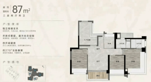 88㎡三房两卫:空间布局合理,功能分区明确。