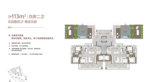 “玥境”滨江小洋楼的低密叠院户型最大亮点是超高赠送率,1F、2F户型赠送私属花园,3F赠送超大景观露台,4F复式设计赠送顶层天台,部分户型使用率最高达262%。