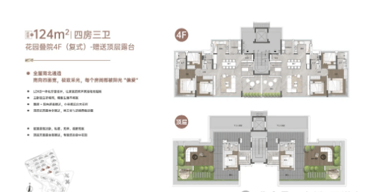 四层约124㎡户型是最接近墅级形态的户型,下层做了侧花园设计,顶层的天面露台全赠送,实现了约242%的使用率,满足业主对墅级生活的向往。