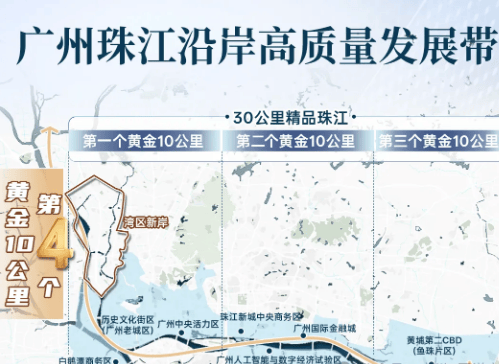 江玥上城所处的湾区新岸板块,并非一蹴而就的新兴区域,而是承载着广州珠江岸线发展新使命的战略要地。作为官方定位的“下一个珠江新城”,这片位于珠江前航道西岸创新带核芯的热土,是继珠江新城、琶洲、白鹅潭之后,珠江第四个“黄金十公里”,也是广州迈向世界级滨水区的战略新核。