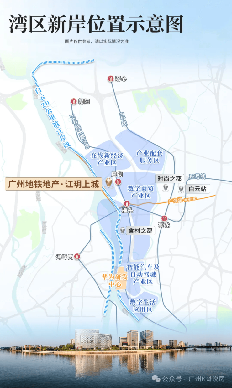 而位于白云湾区新岸核心的广州地铁·江玥上城,凭借地铁地产的国企背书、一线珠江江景资源、百年名校配套以及创新TOD开发模式,从众多项目中脱颖而出。本文将从区域发展、品牌实力、配套资源、产品设计等多个维度,为你全面解析这个备受关注的江景大盘,助你在置业路上精准锚定真实价值。