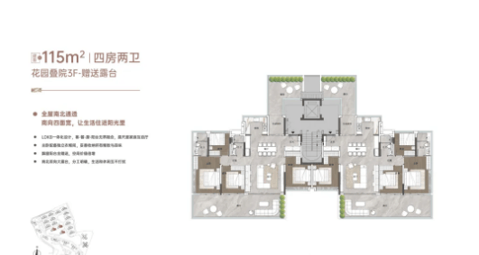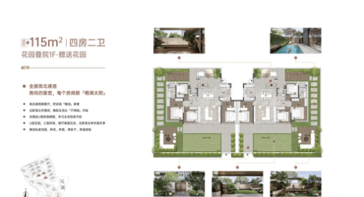 首层约115㎡户型是全盘赠送率最高的户型,首层双花园赠送高达170㎡,使用率做到了262%,内部采用LDKG一体化、南向四面宽设计,空间布局合理,采光通风极佳。