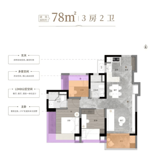 78㎡/88㎡三房两卫:紧凑实用,88㎡户型拥有6.25米超宽阳台,客厅开间约3.5米,主卧带L型飘窗,采光通透,功能齐全,适合年轻家庭。