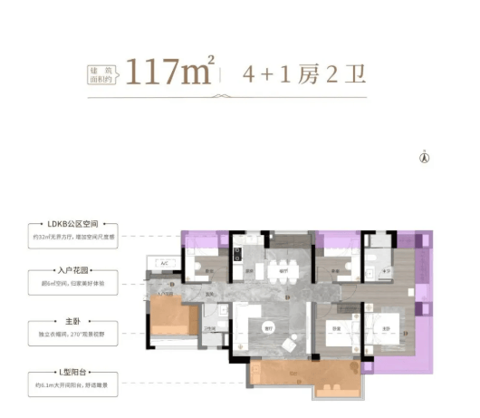 117㎡3+2房:位于小区内部,环境静谧,东南向望山景。竖厅格局,客厅开间达4.5米(不含墙体),面积约32㎡,搭配L型大阳台(最宽处2.3米),可布置茶歇区或小型聚会空间,南北对流,居住舒适度极佳。
