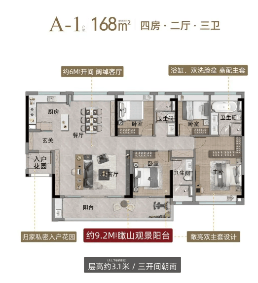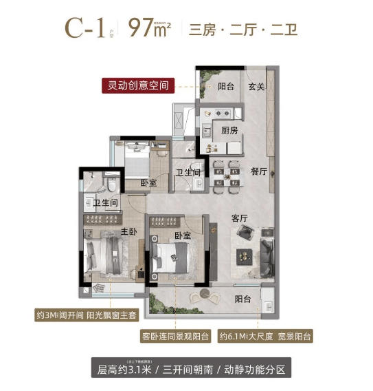 户型亮点集中在 “空间尺度” 与 “居住体验” 上:全屋层高约 3.1 米,比常规住宅高出 10-20 厘米,有效提升空间通透感;客厅连接约 6.1-9.4 米宽景阳台,既保证了充足的采光通风,又能最大化欣赏南向山景;采用 LDK 一体化设计(客厅、餐厅、厨房一体化),增强家庭成员互动性。此外,项目装修标准为片区最高,定制国际品牌六大精装系统,兼顾智能化与人性化,外立面采用超大幕墙比例,堪比高端楼盘的 “钻铂” 设计,颜值与品质兼具。