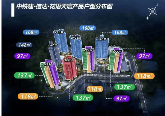 中铁建・花语天宸的户型设计以 “改善型需求” 为核心,注重空间舒适度与功能性的平衡。目前在售的 1-5-6-9 栋中,1/5 栋为 97-118-137㎡户型,6 栋为 142㎡户型(两梯 3 户),9 栋为 168㎡户型(两梯 2 户),全部采用高端住宅基因体系,满足不同家庭结构的需求。
