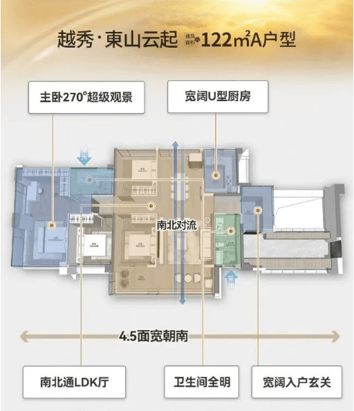 122㎡边户:南北对流双阳台,主卧带270°飘窗,次卧连接空中花园,室内外空间过渡自然。