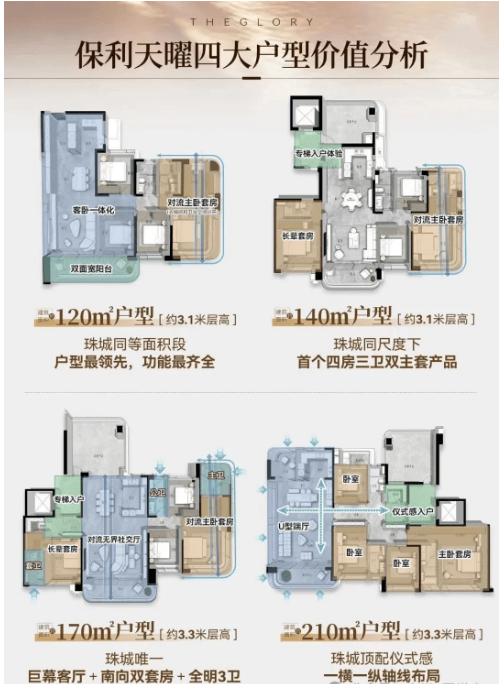 保利天曜分南北地块开发,南地块为板楼设计,共 8 栋;北地块为塔楼设计,共 3 栋。南方面粉厂地块赠送率达 30%,员村绢麻厂地块阳台面积占比 25%,不计容公共开放空间面积 10%,虽使用率略低于南方面粉厂地块,但在全市豪宅中仍处第一梯队。南地块主力户型 120 - 210 平四房,楼间距最宽超 70 米,最窄 50 米出头,保证通风采光与景观视野。南地块正南北全 T2 板楼,户型规整,通风好,互视少,专梯入户;北地块全南向舒展 T3/4 楼型,降低互视,提升通风采光。项目还为业主打造 “六恒系统”,智能调节室内环境,提升居住舒适度。