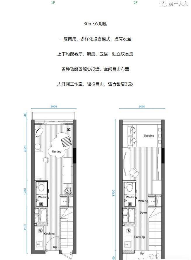 答:“双钥匙”户型是ing未来印在产品设计上的一大创新。简单来说,就是在一个约30平方米、层高约4.5米的单元内,通过设计改造,形成上下两层完全独立、互不干扰的居住套间。每个套间都拥有自己独立的入户门、客厅、卧室、厨房和卫生间,就像两套独立的微型公寓。这种设计的好处非常明显:对于投资者,可以将上下两层分别出租给两户租客,从而获得比单套出租更高的租金回报率,实现“一份房价,双份租金”。对于自住者,可以一层自住,另一层出租,用租金收益抵消部分月供,减轻供房压力;或者作为工作室、兴趣空间等,实现居住与工作的分离。它极大地提升了小户型的实用性和投资灵活性。