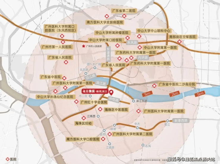 项目1公里范围内有南方医科大学珠江医院(三甲)、广州市红十字会医院昌岗分院(三甲),2公里范围内有广州市海珠区妇幼保健院。这种医疗资源的密度,在广州核心区极为罕见。