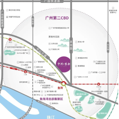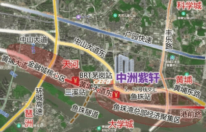 中洲紫轩坐落在黄埔区至天河区东西向主干道——中山大道旁,距离不足30米,虽靠近大马路但得益于优越的地理位置,居民能够轻松抵达城市各个角落。此外,项目距离地铁鱼珠站步行仅需约10分钟,无论是自驾还是公共交通都极为方便。
