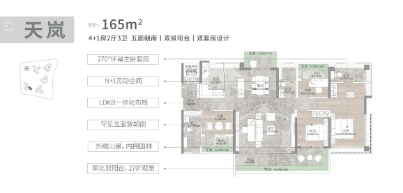 165㎡4+1 房两厅两卫:终极改善户型,17.4 米南向面宽,近 9 米 L 型景观阳台(三面望山),中式厨房 + 独立西式岛台,双主套设计(均带 270° 飘窗),南北对流,满足顶奢居住需求。