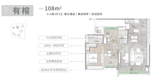 108㎡3+1 房两厅两卫:入门级改善户型,四开间朝南,近 6 米南向阳台(270° 景观),5.9 米 LDKB 一体化大方厅,主卧套房带南向飘窗与 L 型衣帽间,适合三口之家;