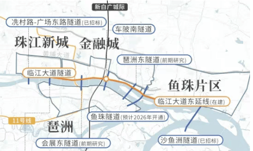 鱼珠片区交通便利,现有地铁线路如11号线、新白广城际等,极大地缩短了琶洲与金融城之间的距离。未来,随着琶洲与珠江新城隧道等项目的建成通车,一江两岸将被彻底缝合,进一步增强区域内的交通便捷性。