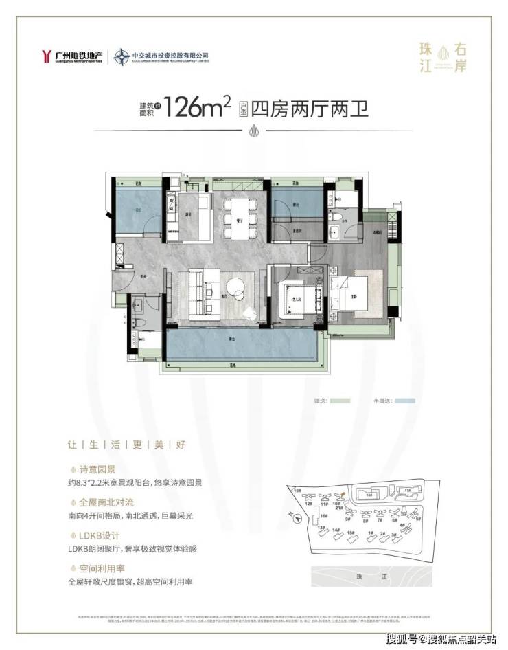 126平横厅户型,同样采用LDKB一体化、南向四开间设计,南北通透。