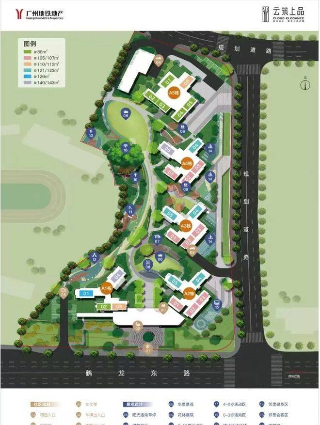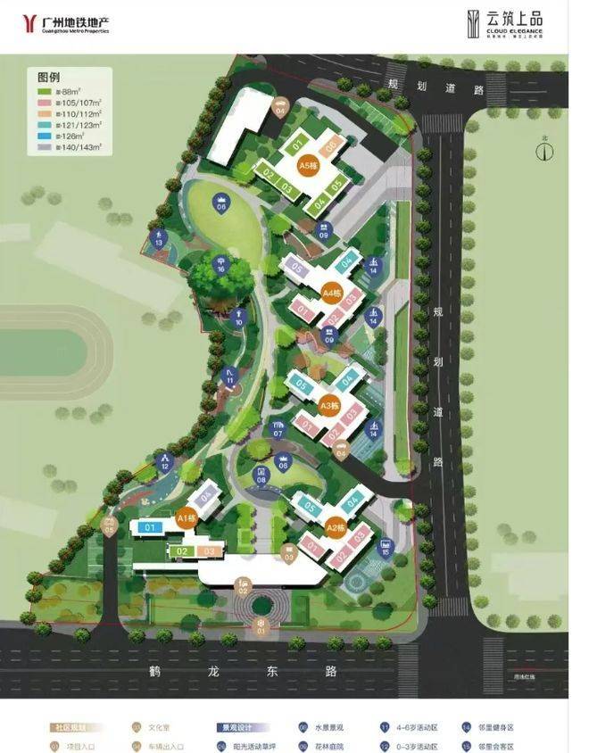云筑上品的基础配套规划得挺不错。占地面积 27941㎡ ,建筑面积 120000㎡ ,容积率 3 ,绿地率 35% ,总户数 766 户 。车位数 1028 个 ,车位比 1:1.13 ,停车基本能满足需求。由广州地铁集团开发,这可是广州市政府全资大型国有企业,秉持 “以城为本、以人为本”TOD 发展理念开发项目。小区规划 5 栋住宅,采用蝶式塔楼设计,为的是采光最大化。小区内设计三条动线,归家、游园和非机动车线尽量少交叉,保障孩子们玩耍安全。还针对不同年龄段孩子设置了互动景观墙、浮岛、树屋、迷你篮球场等设施,满足居民休闲需求。