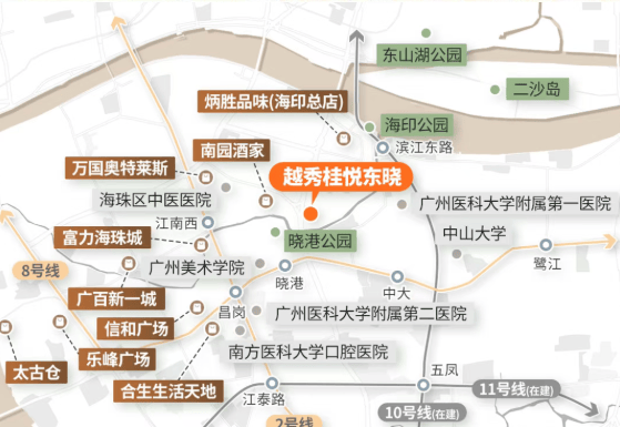 越秀桂悦东晓距离地铁8号线晓港站仅700米,步行即可轻松抵达。周边还有多条公交线路,自驾出行同样方便快捷,家门口就是东晓路,连接昌岗路、新港西路、内环等干线,无论是坐地铁还是开车去珠江新城等地都非常便捷。
