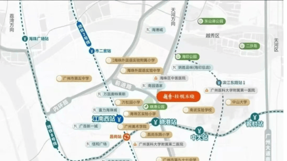 教育方面,项目对口海珠外国语实验附属小学,由万松园小学和海珠实验中学联合创办,师资力量较强。初中派位包含广州市第五中学、海珠外国语实验中学、南武中学附属学校等优质学校,教育配套有保障。医疗资源方面,附近有广州医科大学附属第一医院、广州医科大学附属第二医院昌岗院区等综合医院,以及广东省口腔医院、广东省第一荣军优抚医院等专科医院,能够满足居民更加专业的医疗需求。