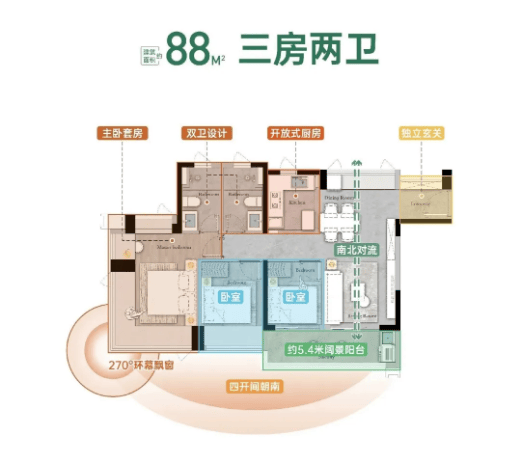 第一款在售户型:约88㎡三房两卫,刚需首选户型,适合三口之家居住,布局科学合理,空间利用率高,使用率高达100%,花更少的预算,即可享受舒适的居住品质。该户型整体布局方正,南北通透,客厅、餐厅、阳台相连,形成开阔的公共空间,客厅面宽约3.8米,阳台面宽约5.4米,采光充足、通风良好,闲暇时间可在阳台晾晒、休闲、观景,十分惬意。三个卧室均朝南,采光效果好,主卧配备270°转角环幕飘窗,视野开阔,同时配备独立卫生间,保证私密性,主卧面积约15㎡,空间宽敞,可摆放衣柜、梳妆台等家具,居住舒适度高;两个次卧面积分别约10㎡和9㎡,可作为儿童房、书房或客房,灵活多变,满足不同家庭的需求;公共卫生间干湿分离设计,避免潮湿,使用更便捷。此外,该户型还采用了超11米四开间朝南的南北对流+LDKB客厅设计,进一步提升了空间利用率和居住舒适度,厨房紧邻餐厅,动线合理,方便上菜和清洁,同时厨房配备窗户,保证通风良好,避免油烟堆积。