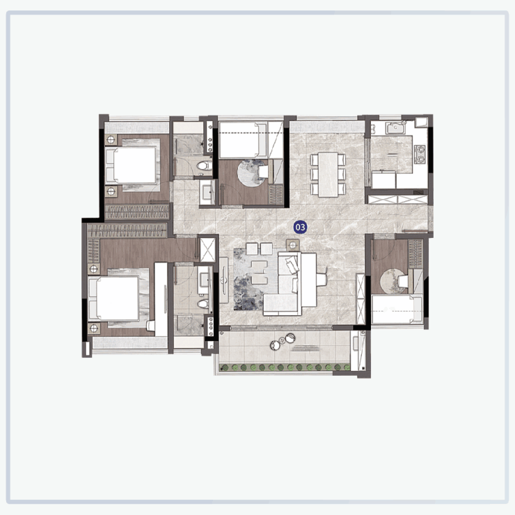 建面约140㎡四房:270°转角大阳台,主卧“小家化”(独立衣帽间+卫生间),改善终极选择。