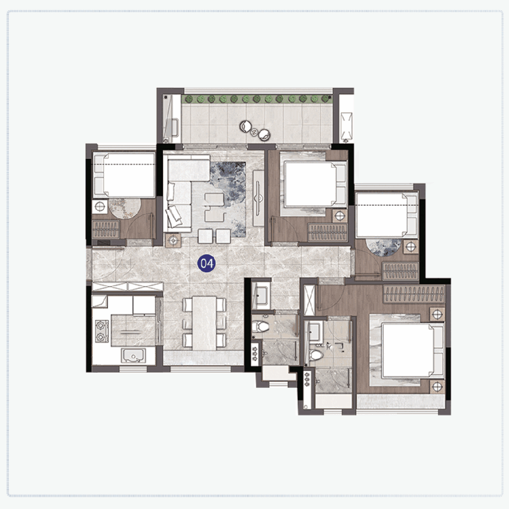 建面约105㎡四房:南北对流+双阳台,主卧套房设计,适合二胎家庭;