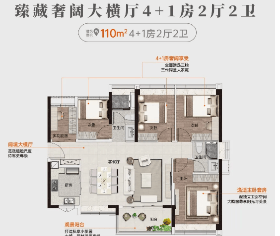 实测实用率高达 93%,通过优化过道、增加飘窗与收纳空间实现零浪费,85㎡做四房、110㎡做五房的设计属区域首创。