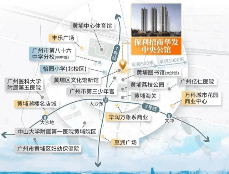 保利招商华发中央公馆位于黄埔区核心区域,紧邻 5 号线与 7 号线二期大沙东站,步行直线距离约 550 米。这一地理位置赋予了项目无与伦比的交通便利性。3 站可抵达天河金融城,10 站无需换乘就能直达珠江新城,日常通勤效率有实打实的保障。对于在天河、海珠等核心城区工作的上班族来说,这里无疑是理想的居住地。