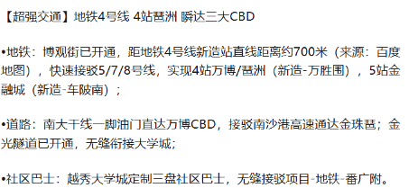 答:大学城核心+番广附名校+地铁4号线+全南向绝版户型,人文与配套双重加持,长期价值成长性极强。