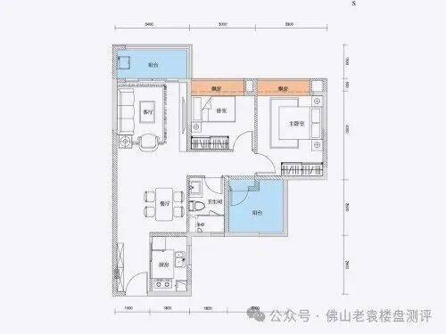 户型亮点:这是项目的入门级主力户型,做到了紧凑的三房两卫。三开间朝南,保障了客厅和两个卧室的日照。竖厅设计,动静分区相对清晰。主卧室配备了独立卫生间和飘窗。在约85㎡的面积段里实现两个卫生间,提高了早晚高峰时段家庭生活的效率,尤其适合年轻夫妻或三口之家初期居住。