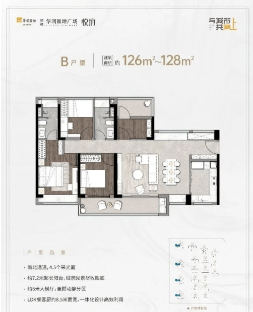 128㎡三房两卫:新规设计,四开间朝南,实用率近95%,南北对流+U型飘窗,空间通透,适合年轻家庭。