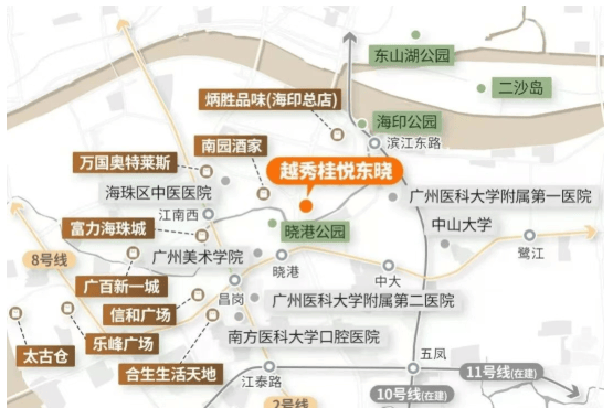 越秀桂悦东晓位于海印桥南晓港板块,地处东晓路边上,紧挨内环路高架桥。地块于去年年底由越秀以总价19亿元拿下,楼面价约3.2万/平。小区规模不大,仅有3栋楼,共565户。周边配套成熟,地铁、商业、医疗等一应俱全,对面是晓港公园,距离地铁8号线晓港站近,前往越秀和珠城便捷。近期加推3号楼,并开放了实体展示区与实体板房。售楼处电话:提供购房咨询的联系方式400 - 828 - 5661