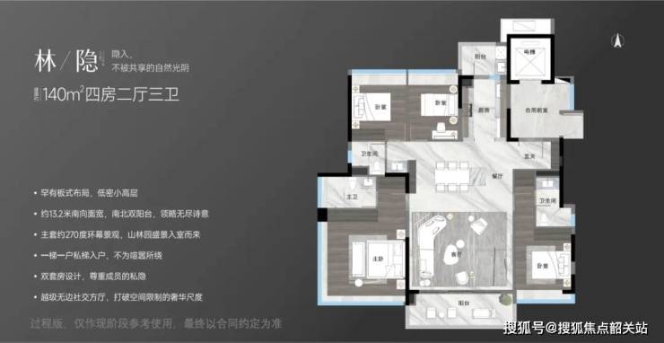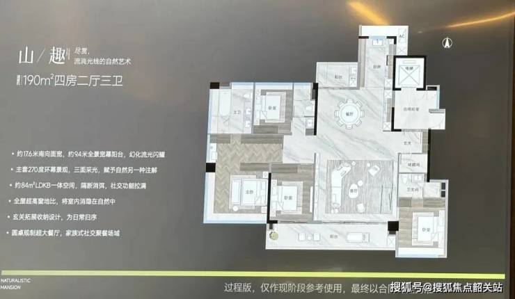 190㎡四房三卫:四开间朝南,客厅与次卧打通后开间达9.4米,超43㎡主卧套房,总价约1480-1600万元。