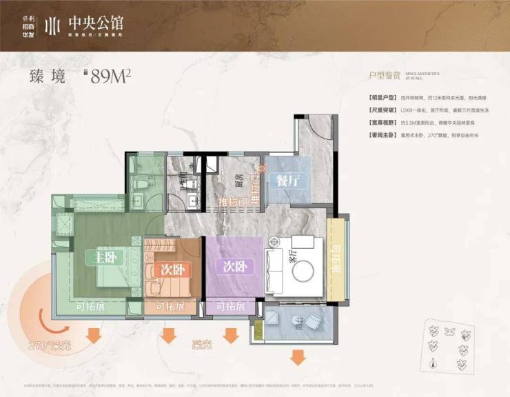 89㎡三房两厅两卫:双卫设计,主卧套房,动静分区,总价338万起;