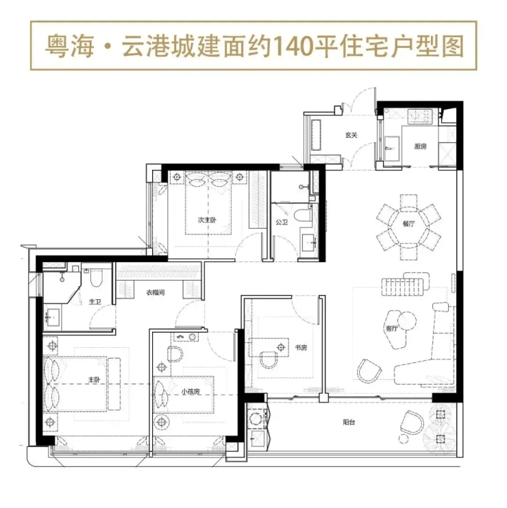 140㎡四室两厅两卫:总价约600万元起,是项目主力户型。采用经典“动静分区”布局,客厅与卧室互不干扰,主卧套房设计保障私密性,三间次卧灵活可变,适合三代同堂或二胎家庭。南北通透,采光通风俱佳,得房率优于市场平均水平。