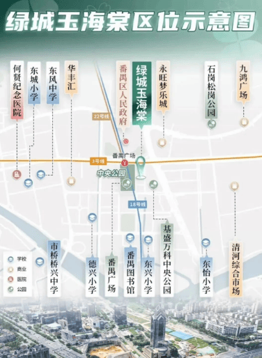 绿城玉海棠的选址堪称点睛之笔,坐落于番禺广场中轴线上,与番禺区政府直线距离仅 200 米,步行片刻即可抵达。周边财政局、税务局、教育局等职能部门环绕,番禺图书馆等市政配套近在咫尺,行政核心区的成熟城市界面的优势尽显,无论是日常办事还是享受公共服务都极为便捷。更难得的是,项目与番禺广场 E 口无缝衔接,真正实现地铁上盖的居住体验,无需长途跋涉,下楼即达地铁站,让通勤成为一种享受。