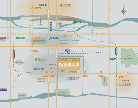 广州地铁地产・珑曜上城雄踞番禺区亚运大道核心板块,总占地约 28 万㎡,总建筑面积约 68 万㎡,是区域内罕见的超大规模 TOD 综合体项目,分四期开发,规划户数超 3800 户,建成后将成为集居住、教育、商业、生态于一体的全能生活大城。项目占据广州新城核心位置,依托亚运大道城市发展主轴,紧邻千亿产业集群,区位优势得天独厚,发展潜力无限。