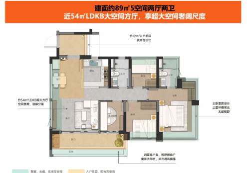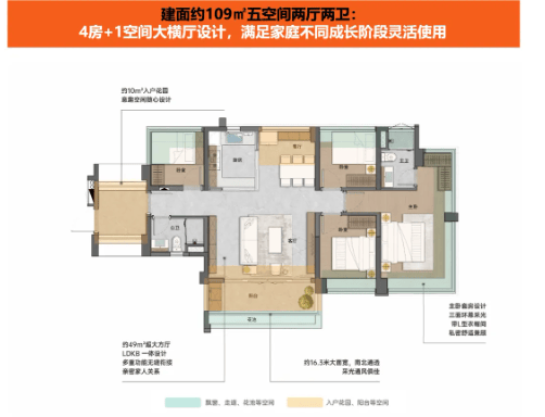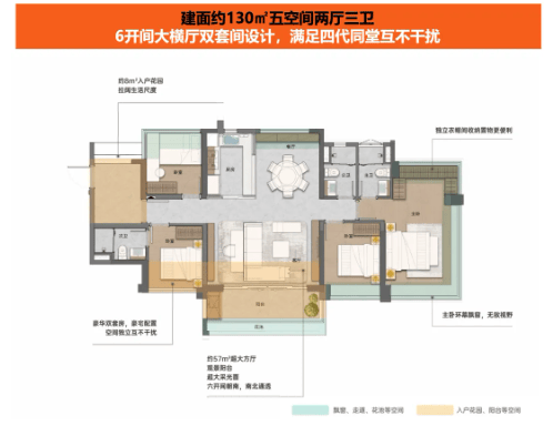建面约 106㎡户型,五开间朝南,约 16.3 米超大面宽,南北对流,空间格局与居住体验堪比 140㎡以上豪宅,三代同堂居住舒适不拥挤。建面约 130㎡户型,创新打造 5 空间 + 双主套设计,将传统 160㎡以上户型才具备的双主套功能,以更少面积实现,LDKB 方厅约 57㎡,搭配主卧 270° 飘窗、独立衣帽间,奢华感与实用性兼具,满足高端改善需求。