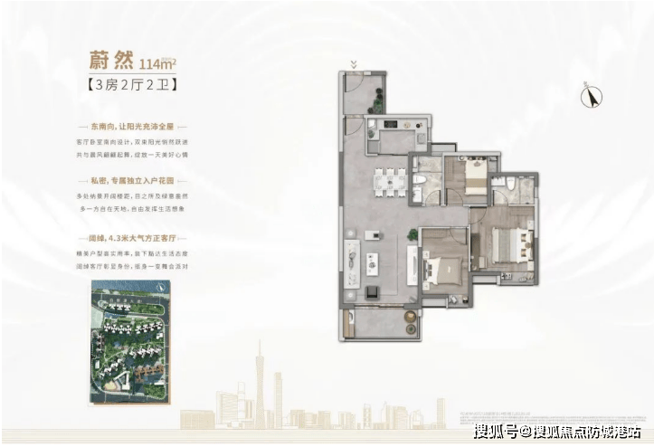 109㎡三房两厅两卫:双阳台设计,南北对流,主卧套房配独立卫浴,二孩家庭首选;