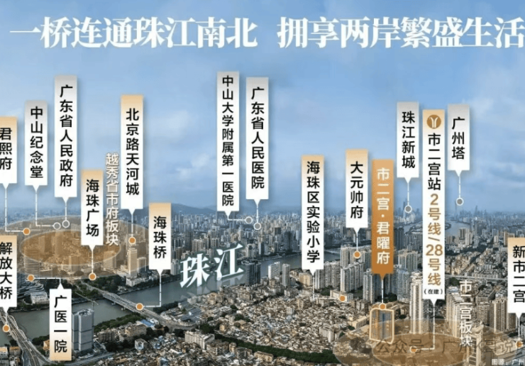 君曜府位于地铁2号线与规划中28号线(广佛环线段)交汇的市二宫站上盖,实测步行至地铁口仅100米,2站直达海珠广场、4站通达珠江新城。周边江南大道、内环路、滨江路等主干道环绕,自驾高峰期通勤时间比周边板块缩短30%。楼下即市二宫公交枢纽,超20条公交线路覆盖全市。