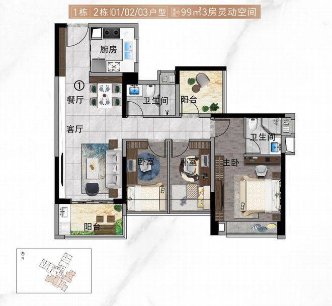 住宅主要户型为99㎡三房两厅两卫及125㎡四房两厅两卫,均采用全南向设计,通透空间布局,动静分区合理。配备双阳台、瞰景阳台及灵动阳台,兼顾生活便利与休闲需求。公寓户型36㎡、52㎡、65㎡灵活设计,适合投资及多样化居住需求。