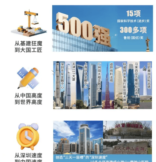多年来,中建三局参建了50余座300米以上超高楼及8座摩天大楼,缔造了“深圳速度”和“中国速度”的建筑新奇迹。在国内外诸多标志性建筑的建设中,都能看到中建三局的身影,例如迪拜的哈利法塔、科威特的中央银行新总部大楼、上海的环球金融中心等。