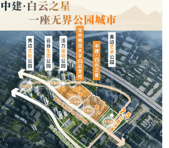 中建·白云之星位于设计之都·黄边公园旁,地理位置优越。项目由中建三局与白云城发联合开发,计容面积约85万㎡,总建筑面积约112万㎡,规模庞大,能够为业主提供丰富的生活配套和充足的活动空间。