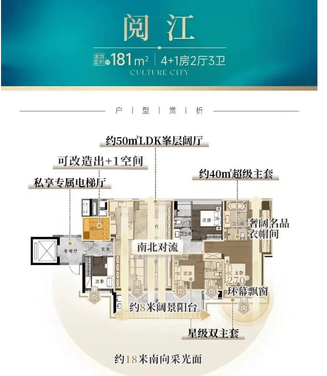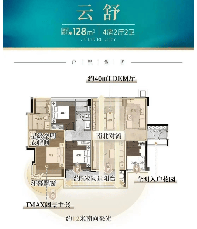 建面约128㎡的四房户型,提供约16米南向采光、南北对流设计,拥有一个约40㎡的阔厅,适合注重家庭互动的住户。