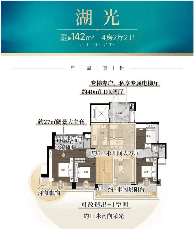 建面约142㎡的四房户型,拥有约16米南向采光,站在约8米全景阳台上,可以欣赏到约1.2万平方米的湖景风光,高层还能望江,是享受生活的绝佳选择。