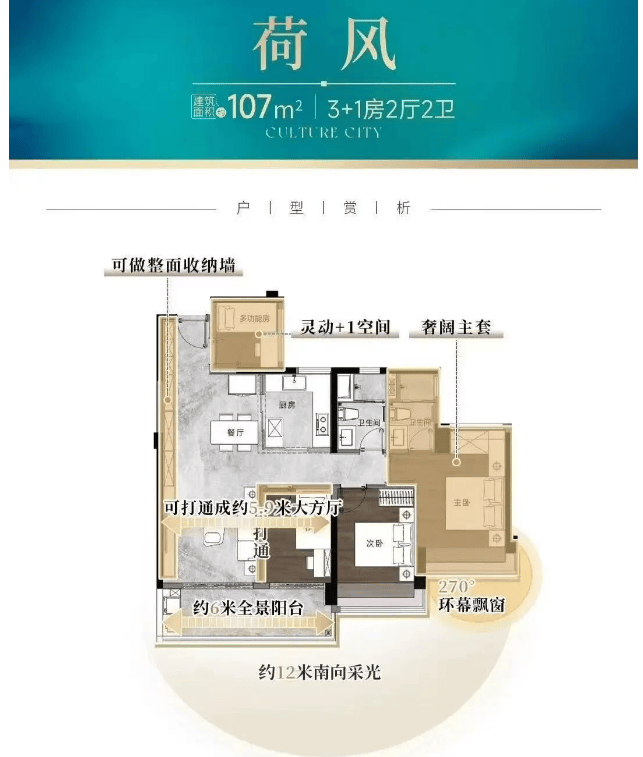 建面约107㎡的四房户型,拥有12米南向采光面,LDK一体化设计,带独立入户花园,适合追求舒适生活的小家庭。