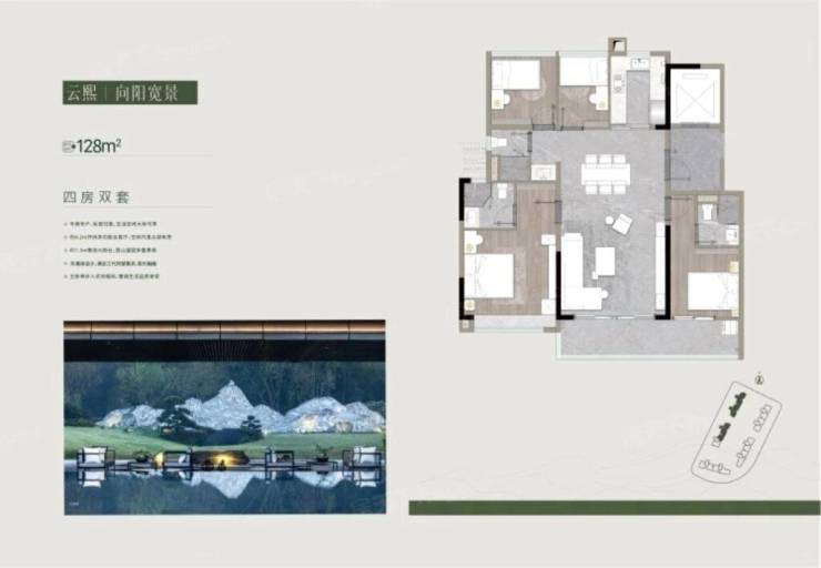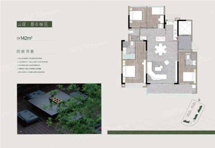 A:目前主要在售 128㎡、142㎡、172㎡三种四房户型,均为精装修交付,一梯一户设计,得房率高。