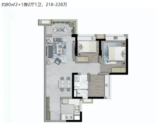 81㎡:2+1房(书房可改卧室),双阳台,南北通透,适合单身或小夫妻;